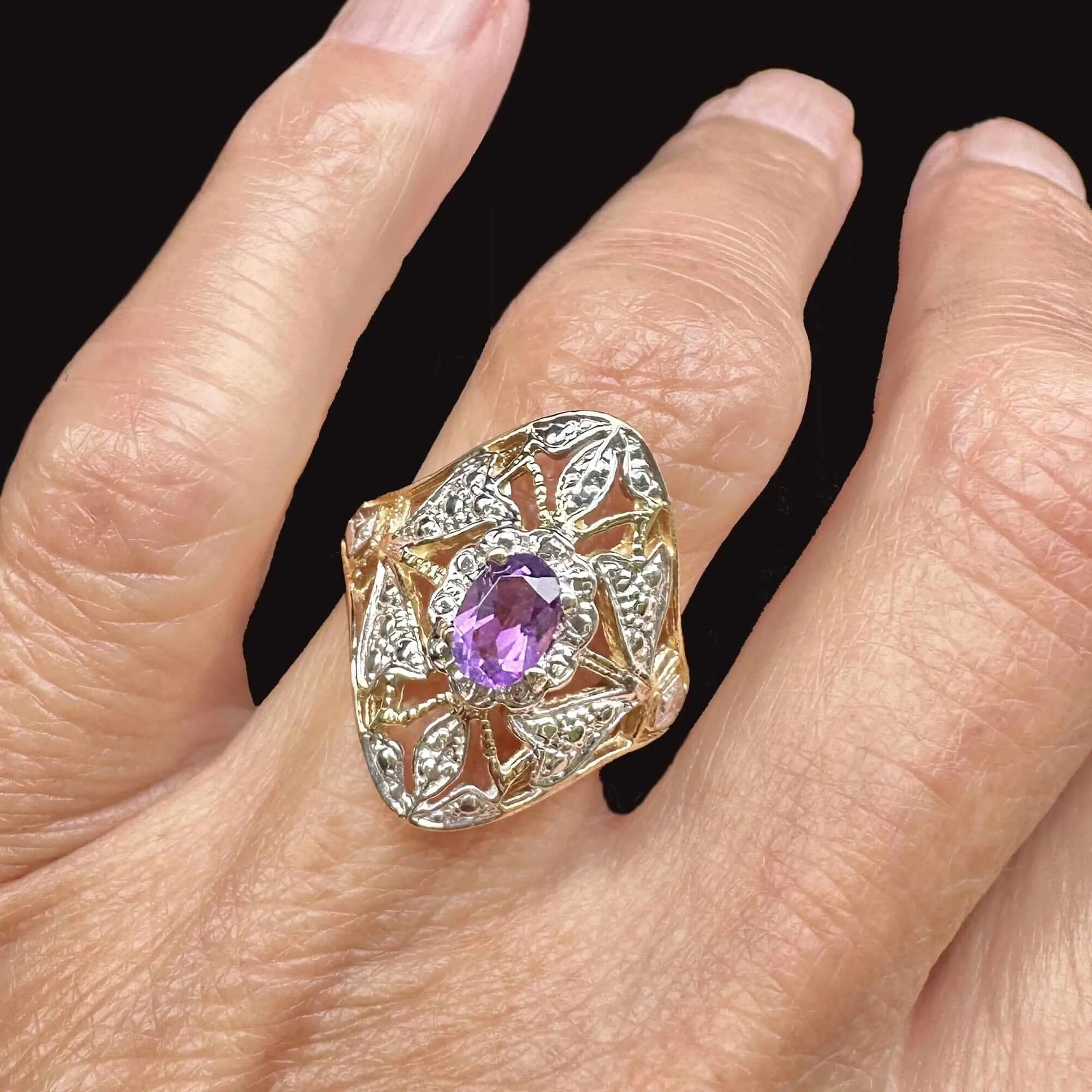 This wonderful vintage ring has an elevated oval amethyst stone in a beautiful filigree of 10K white and yellow gold. The medium purple natural gem is showcased with a cascading floral and leaf panel, giving off a truly stunning and classic look!