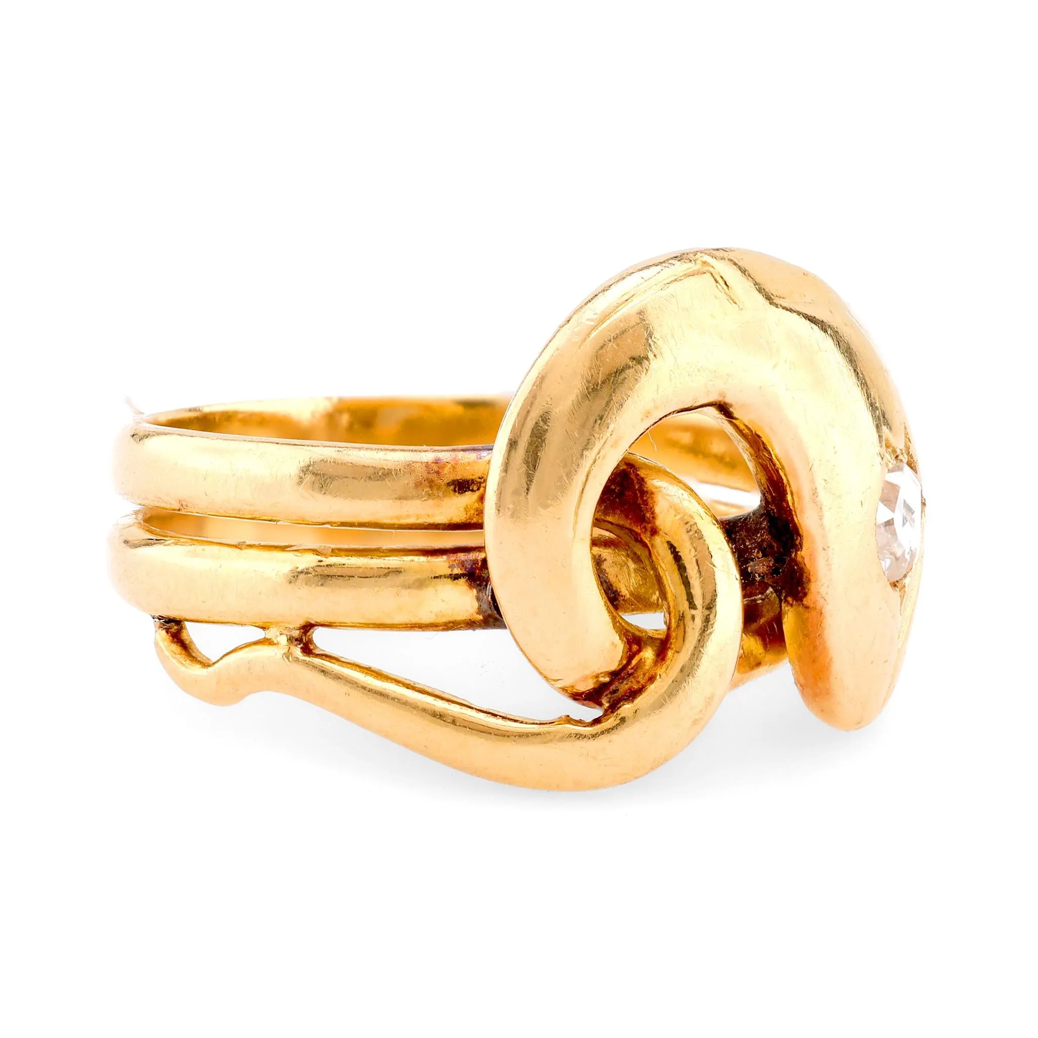 This enchanting Victorian French Snake Ring is a beautiful representation of the romantic and symbolic jewelry of the 1900s. The ring features a single Rose Cut diamond at its center, weighing approximately 0.10 carat, with H color and SI clarity, adding a subtle sparkle to the piece. Crafted in rich 18 karat yellow gold, the ring's intricate snake design embodies both elegance and mystery, a hallmark of Victorian era jewelry. Hallmarked with the French Owl, this ring weighs 7.44 grams and is sized at 7.25, with the option to be resized. A timeless and unique piece, this ring is a captivating addition to any fine jewelry collection, celebrating the enduring allure of Victorian design.